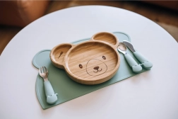Krožnik FreeON v obliki koale spodbuja samostojno hranjenje otrok in hkrati popestri vsak obrok. Prisesek na spodnji strani varno drži na gladki površini in zmanjšuje nered za mizo. Trije praktični predelki pomagajo razdeliti hrano in podpirajo raznoliko prehrano.
