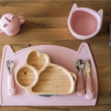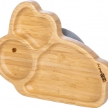 Ljubek otroški krožnik v obliki zajčka iz kakovostnega bambusa z odstranljivim priseskom za trdno pritrditev na mizo. Ima 3 predelke za pregledno serviranje, varne materiale brez BPA, PVC, ftalatov in melamina ter preprosto vzdrževanje.
