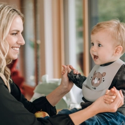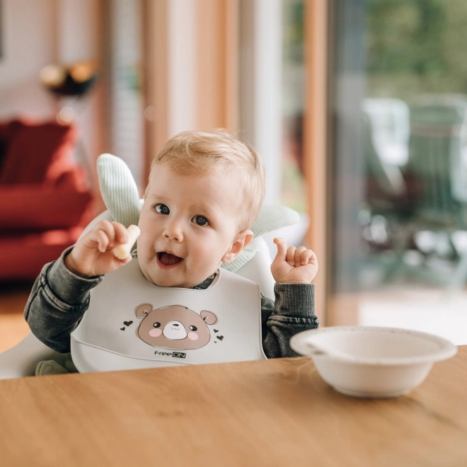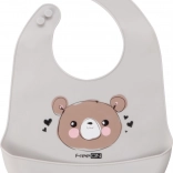 Se pri vsakem hranjenju borite proti madežem? Ta silikon slinček z motivom medvedka vam bo pomagal! Je mehak, lahek in udoben, zato ga vaš otrok prenese tudi ob daljšem sedenju pri mizi. Zaradi prilagodljivega zapenjanja na vratu bo slinček rasel z vašim otrokom. Velik žep za ujete drobtine poskrbi, da ostanki hrane končajo tam, kjer morajo, in ne na oblačilih vašega otroka.