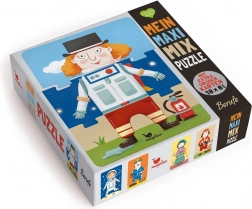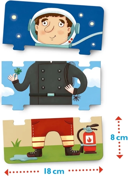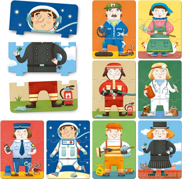 Set vsebuje skupaj 24 koščkov, iz katerih nastajajo trodeli miks kombinacije. Otroci med sestavljanjem na nevsiljiv način urijo koncentracijo, fino motoriko in spoznavajo različne poklice. Ilustracije avtorice Pine Gertenbach dajejo sestavljanki nežen, igriv slog.