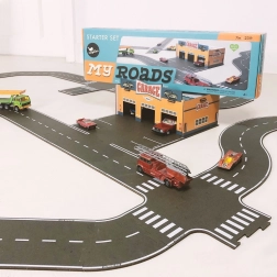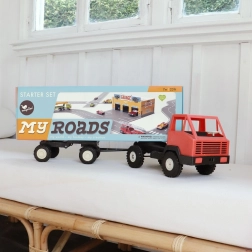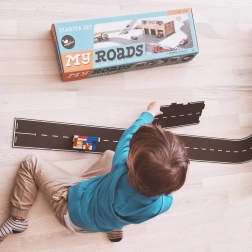 Začetni komplet MyRoads otrokom prinaša neskončne možnosti sestavljanja tras do dolžine 700 cm. Deli iz trpežnega materiala na osnovi recikliranega lesa se gladko povezujejo in držijo obliko, tako da si lahko otroci ustvarjajo mesta, dirkalne kroge in prometna vozlišča. Brezčasen retro videz bo razveselil male in velike graditelje.