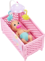 Odkrijte čar nege dojenčka z igračnim setom Barbie Skipper Varuška. Ta prikupen set prinaša punčko Skipper, dojenčka z zapirajočimi se očkami, posteljico z vrtečim kolescem in praktične dodatke za uspavanje – stekleničko, dudo, medvedka, knjižico in odejico. Otroci lahko razvijajo domišljijo, čustveno inteligenco in skrbniške spretnosti pri igri varuške.