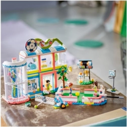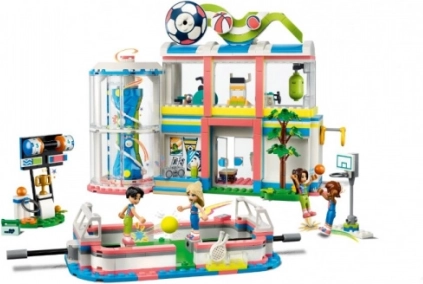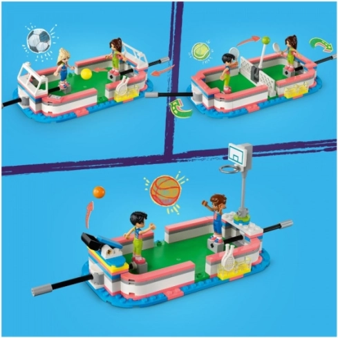 LEGO Friends športni center prinaša otrokom neskončne možnosti igre. Modularno igrišče preprosto spremenite iz nogometa v tenis ali košarko, ne manjka tabela z rezultati, varno shranjevanje žog niti podrobno opremljeno zaledje – telovadnica, plezalna stena in garderoba. Z aplikacijo LEGO Builder je sestavljanje intuitivno zahvaljujoč približevanju, vrtenju modela in spremljanju napredka.