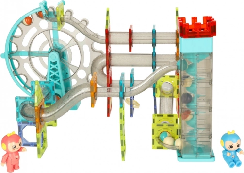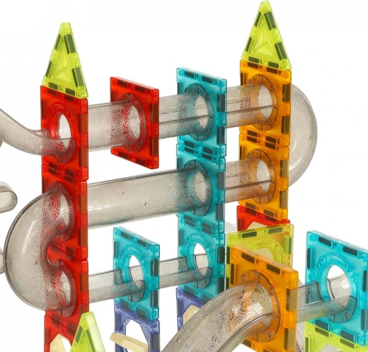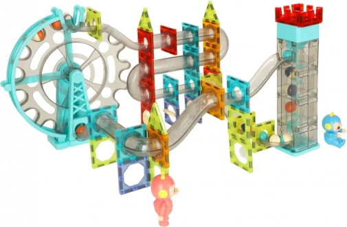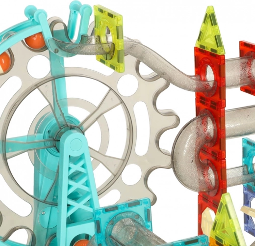 Ta barvita magnetna sestavljanka omogoča otrokom graditi stabilne stolpe, tunele in 3D konstrukcije ter pri tem opazovati, kako kroglice potujejo skozi prozorne cevi in rampe. Modul z vrtljivim kolesom in dvigalom ohranja kroglice v gibanju, zvočni element pa igri doda veselo melodijo. Deli so iz trpežne, prozorne plastike z magneti, ki omogočajo hitro in kreativno sestavljanje.