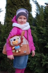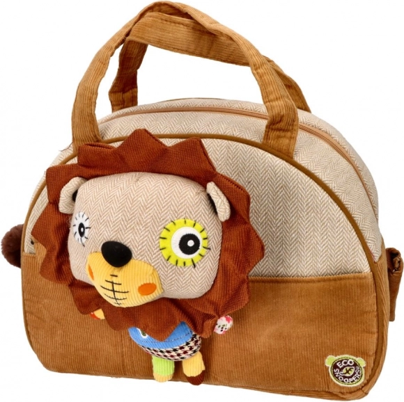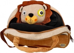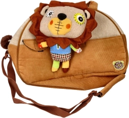 Plišasta igračka v obliki leva, ki je del torbice, ponuja otrokom zabavo in udobje.