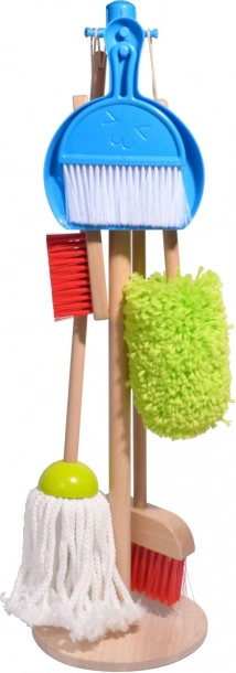 Ta garnitura vsebuje barvita igralna orodja, med katerimi so metla, mop in peresnica za prah, kar krepi vizualno privlačnost in igralno izkušnjo otrok.