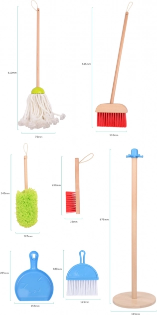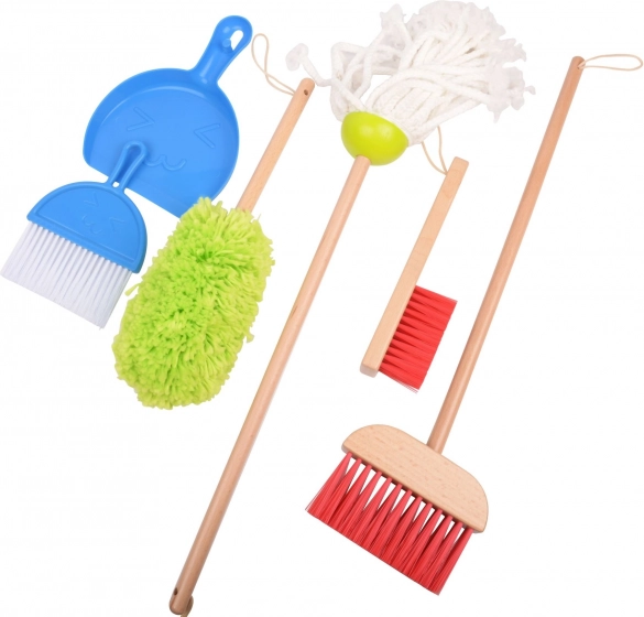 - Velika metla, mop, peresnica za prah, mala metlica z ročajem, plastični smetiš z lopatico, leseno stojalo