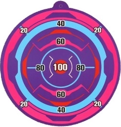 Pisano obarvana tarča z jasno označenimi conami in sredino 100 točk motivira otroke k natančnemu streljanju in napredku.