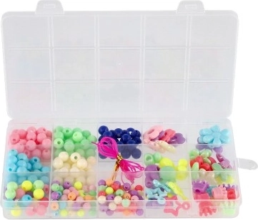 Plastične perlice različnih oblik in velikosti, vrvica, plastična škatlica s predelki
