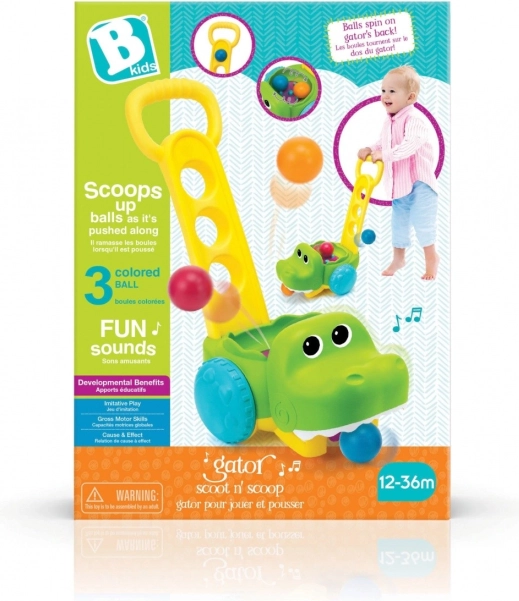 Odkrijte prikupnega krokodila, ki se pri potiskanju spremeni v mali »sesalnik« za žogice. Otroci zgrabijo udoben ročaj, poženejo igračo in opazujejo, kako krokodil pobira barvne kroglice v gobec ter jih nato radostno izstreljuje ven. Interaktivni zvoki motivirajo k novim korakom in podaljšujejo igro.