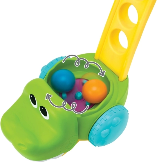 Pri potiskanju krokodil »požira« žogice, ki nato poskakujejo ven – zabava, ki otroke vabi k novim korakom.