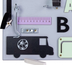 Tablo lahko postavite na mizo, položite na tla ali jo obesite na steno zahvaljujoč integriranim obešalom. Priložen je tudi samonalepilni filc, ki ščiti tla pred praskami. Zabava, ki razvija: fino motoriko, potrpežljivost, domišljijo in razmišljanje v povezavah.