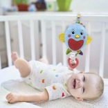 Ptička lahko enostavno pritrdite na posteljico ali voziček s pomočjo traku z ježkom. Odličen je kot pomoč staršem pri komunikaciji z dojenčkom in pri razvijanju prvih logičnih asociacij otrok.