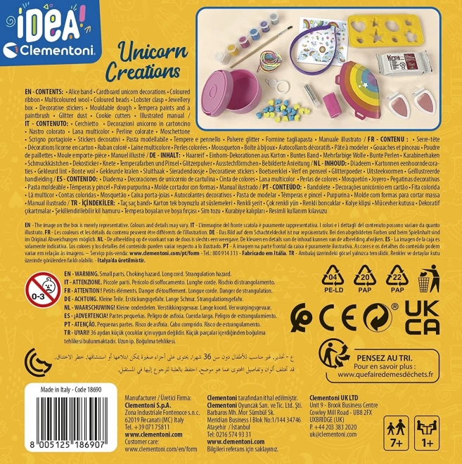 Z ustvarjalnostjo je svet takoj bolj barvit! Ta ustvarjalni set omogoča izdelavo prisrčnega naglavnega traku, zapestnice iz perlic, škatlice za nakit ali škatlice za drobnarije s figurico samoroga. Del seta je tudi barvita obesek za ključe z cofkom. Spodbuja razvoj ustvarjalnosti, domišljije in ročnih spretnosti.
