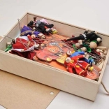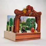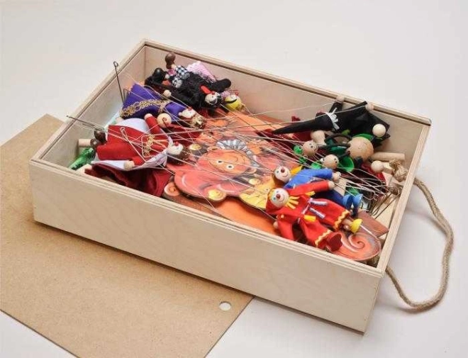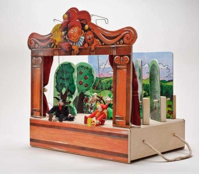 Leseno gledališče z 2 dvostranskimi kulisami in 8 lutkami. Ročno izdelane lutke z možnostjo razširitve z dodatnimi lutkami in kulisami.