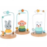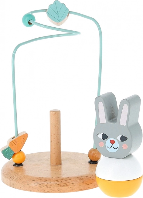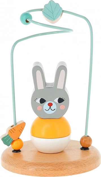 Ta leseni labirint s kovinsko potjo in figurico zajčka ponuja zabavno aktivnost, pri kateri otroci premikajo kroglice in oblike (korenček, list) po valoviti trasi. Igrača spodbuja razvoj fine motorike, osredotočenost in potrpežljivost, hkrati pa je varna in stabilna zaradi čvrstega lesenega podstavka.