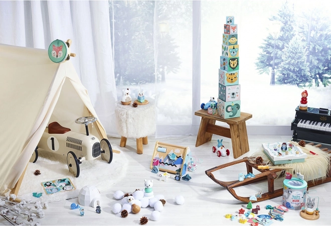 Kombinacija lesa in kovine z zaobljenimi robovi zagotavlja stabilnost in dolgo življenjsko dobo igrače pri vsakodnevni igri.