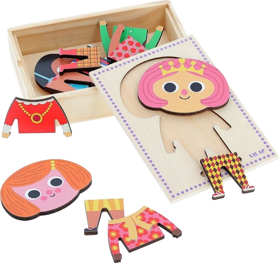 Sestavljanka z oblačili Jade s 6 različnimi oblekami omogoča otrokom ustvarjanje neštetih kombinacij in razvijanje njihove kreativnosti ter motorike. Vsebuje 18 delov v praktični škatli.