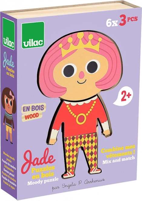 Lesena sestavljanka z oblačili ponuja otrokom možnost stilskega oblačenja figurice Jade. Z 6 različnimi kompleti lahko otroci kombinirajo obleke in razvijajo svojo domišljijo.