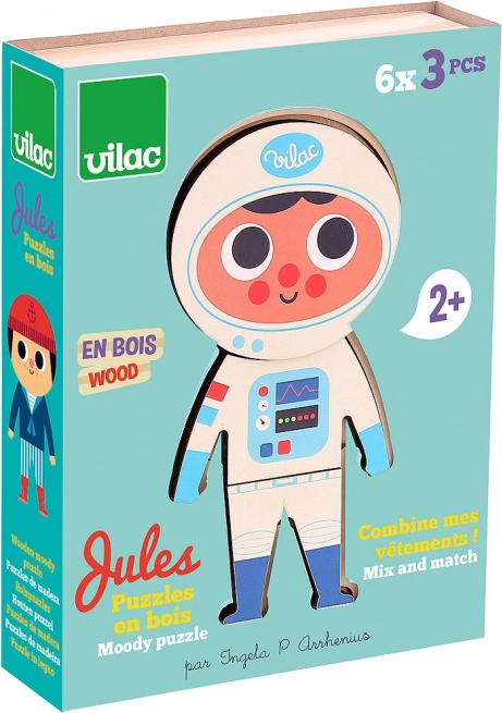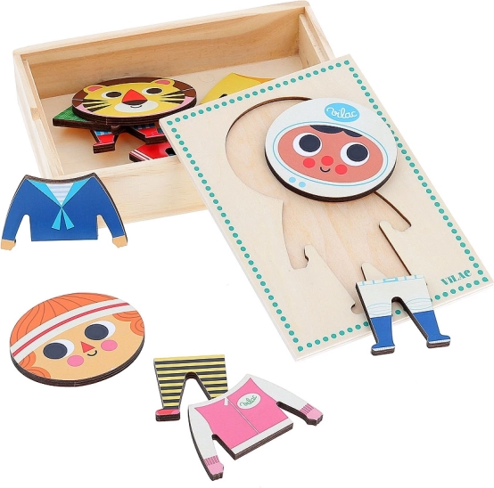 Vilac sestavljanka oblačila Jules je lesena igrača, ki je idealna za razvoj motorike, opazovanja in ustvarjalnosti otrok. Vsebuje 18 kosov, ki omogočajo ustvarjanje skupno 6 osnovnih oblek. Otroci lahko mešajo posamezne kose in tako ustvarijo neskončno število kombinacij: