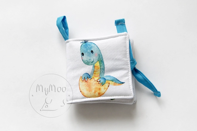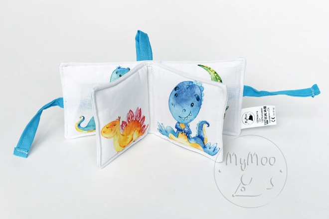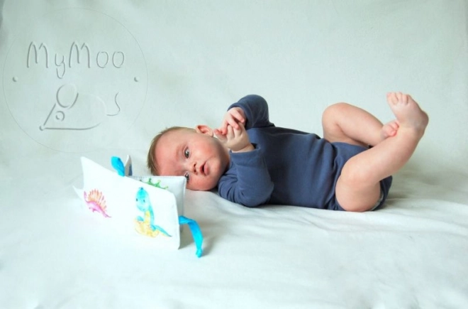 Mini soft book MyMoo – Potovanje v prazgodovino je zasnovana za majhne otroške ročice. Tekstilna izvedba je prijetna na dotik, varna in odporna proti mečkanju, zato dobro prenese vsakodnevno uporabo doma in na poti. Pestroraznolikost ilustracij prazgodovinskih živali naravno razvija zaznavanje, pozornost in prve besede.