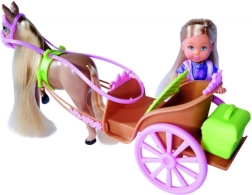 Set Evi Love v romantični kočiji prinaša otrokom neskončne možnosti zgodb – od voženj kraljice ali princese do vsakodnevne skrbi za konjička. Evi udobno sedi, drži vajeti, njen usklajen outfit pa poudarja čarobno vzdušje igre.