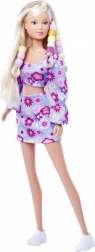 Punčka Steffi v cvetličnem dvodelnem outfitu, s kavljem za natikanje kroglic na pramen las, barvnimi kroglicami, elastiko za fiksiranje in glavnikom z odlagalnim prostorom. Višina punčke je 29 cm.