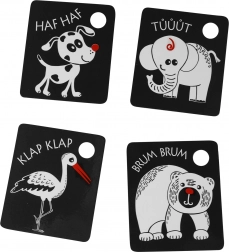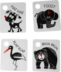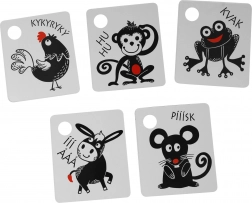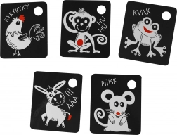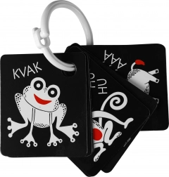 Vsaka kartica ima praktično odprtino za obešanje na posteljico, voziček ali igralni lok, del paketa pa je tudi trpežen plastični obroček za preprosto povezovanje celotnega seta. Kakovostni češki materiali zagotavljajo dolgo življenjsko dobo in varno uporabo.