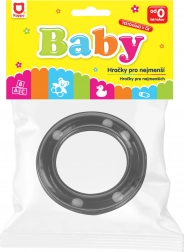 Lahka in enostavna za prijem ropotuljica v obliki kroga v elegantni črni barvi. Otroci bodo vzljubili njen nežen ropot, ki pritegne pozornost in spodbuja razvoj čutov ter fino motoriko.