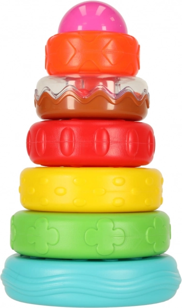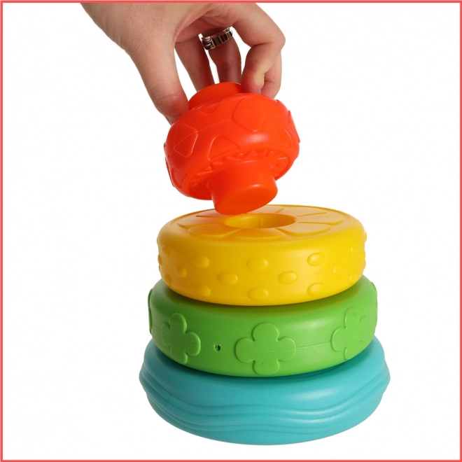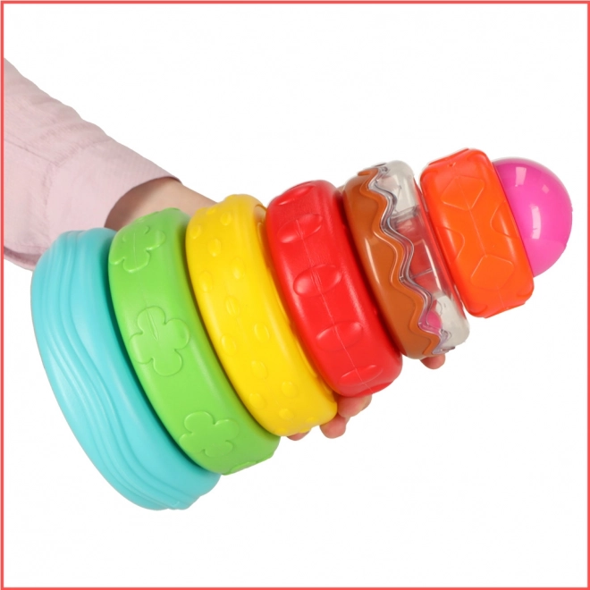 Ta stabilen in varen senzorični stolp prinaša otrokom prvo veselje do učenja skozi igro. Obroči različnih velikosti, barv in tekstur podpirajo fino motoriko, koordinacijo oko–roka in razlikovanje barv. Eden od obročev ima prozoren zgornji del s kroglicami, ki ropotajo, kar dodatno spodbuja sluh.