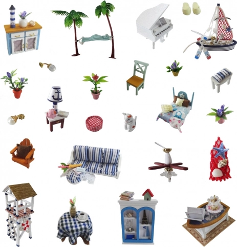 Vključeni so miniaturni kosi pohištva in dekoracij – od viseče mreže in pianina do rož in svetilk. Vse za realističen in prijeten interier.
