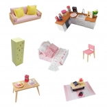 Del opreme so miniaturni kosi pohištva, ki hišici dodajo realističen videz.