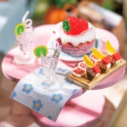V paketu najdete lepilo, barve, čopič in drobne dodatke. Čakajo vas prikupne mini dekoracije – baloni, cvetje, pohištvo in izložbe z napisi.