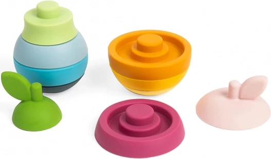 Silikon je trpežen, nestrupen in prijeten na dotik – zlahka ga ohranjate čistega, ne vpija vonjav ali madežev, igračo pa lahko pomivate v pomivalnem stroju. Sadni motiv naravno vabi k igri, razvija domišljijo ter spodbuja zaznavanje barv in velikosti.