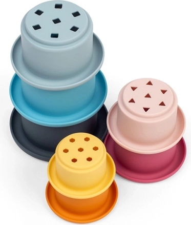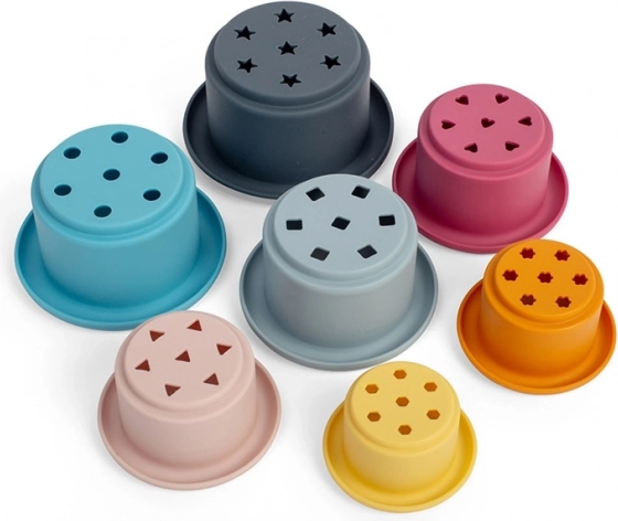 Barvit komplet sedmih zložljivih skodelic iz 100 % silikona za stik z živili brez plastike. Idealno za kopel, peskovnik in dom. Vzorčaste odprtine na dnu ustvarjajo učinek slapov, otroci vadijo fino motoriko, koordinacijo oko–roka in prepoznavanje barv. Material je trpežen, netoksičen, enostaven za čiščenje in ga je mogoče pomivati v pomivalnem stroju.