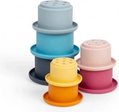 Brezplastni 100 % silikon je mehak za otroške roke, hkrati pa zelo odporen na temperature in madeže. Preprosto vzdrževanje – zadostujeta topla voda in blago milo ali pomivalni stroj. Igra s skodelicami podpira motorične spretnosti, senzorično zaznavanje, ravnotežje in prve logične miselne procese.