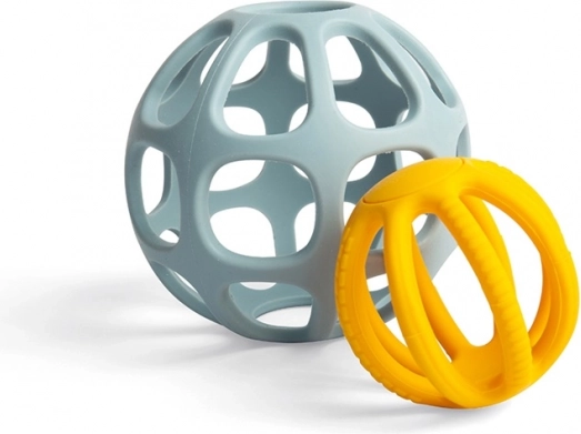 Set dveh silikonskih žogic za najmlajše podpira razvoj fine motorike, krepitev prijema in prinaša olajšanje pri rasti zobkov zahvaljujoč funkciji grizala. Vzdržljiv, netoksičen material se enostavno čisti in je primeren za pomivalni stroj. Manjšo rumeno žogico je mogoče vstaviti v večjo, kar spodbuja logično razmišljanje in na zabaven način razvija spretnosti.