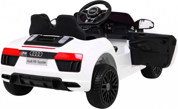 LED luči spredaj in zadaj, panel MP3/USB/SD/AUX in gumba na volanu. Odpiralna vrata in avtentični elementi vozila AUDI R8 bodo razveselili vsakega otroka.