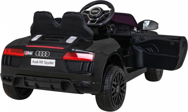 Majhen voznik, veliko veselja. Električni avtomobilček AUDI R8 Spyder v elegantni črni barvi ponuja privlačen videz pravega športnega vozila, enostavno upravljanje in varen pogon. Zahvaljujoč dvema motorjema 35 W in postopnemu zagonu je vožnja udobna in stabilna, medtem ko sprednje in zadnje vzmetenje duši neravnine.