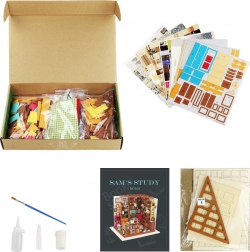 Vse potrebno je vključeno v paketu – od predrezanih delov iz vezane plošče preko papirnatih in tekstilnih elementov do lepila, barv in čopiča. Sestavljanje vključuje barvanje in lepljenje, delo z drobnimi detajli ter potrpežljivo zlaganje, kar ga naredi za idealen projekt za miren vikend.