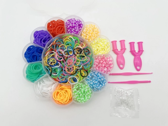 Kreativni komplet za male in velike ustvarjalce: 900 kosov barvnih elastik v škatlici v obliki rože, dopolnjen z ročnim stativom, kaveljčkom in spojkami. Ustvarjajte izvirne elastične zapestnice, obeske in okraske, razvijajte spretnost in uživajte ure zabave.
