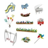 - Podrobni dodatki – pohištvo, rože, igrišče, dekoracije in druge miniature.