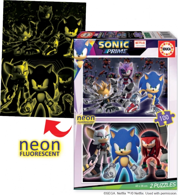 Uživajte v zabavi z dvema neon puzzlema Sonic Prime znamke EDUCA, ki svetita v temi zahvaljujoč posebnemu fluorescentnemu sloju. Vsak puzzle ima 100 koščkov in mere 40 x 28 cm.