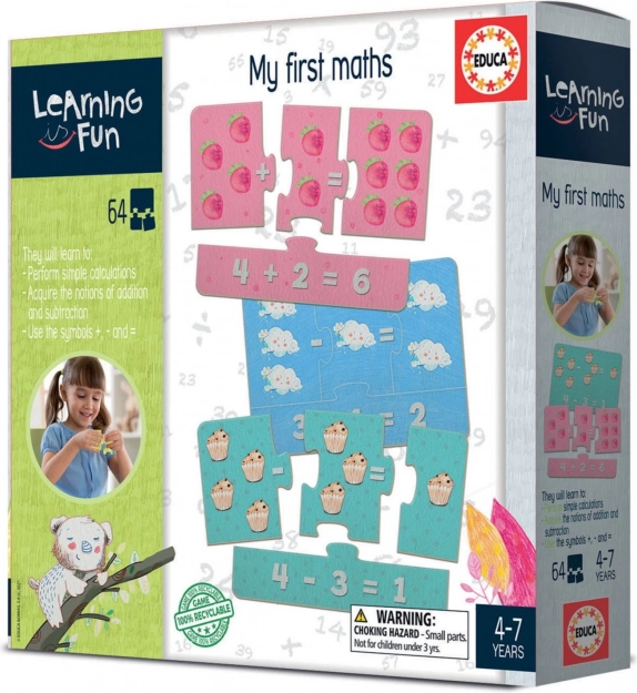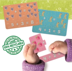 Izobraževalne sestavljanke in igra Moja prva matematika iz linije EDUCA Learning is Fun so odličen pomočnik za predšolske in mlajše šolske otroke. Na igriv način jih vodijo skozi prve korake v matematiki – od prepoznavanja števil do preprostih računskih nalog. Otroci sestavljajo štiridelne sestavljanke, kjer se vsak pravilen rezultat prilega na svoje mesto, kar spodbuja razumevanje povezanosti.