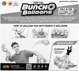 Vodni balončki Bunch O Balloons uporabljajo tehnologijo O-Ring in ponujajo hitro polnjenje. Povežite jih na pipo ali vrtno cev in v manj kot 60 sekundah imate pripravljenih 100 vodnih bombic! Lahko jih mečete na prijatelje ali uporabite aerodinamični izstreljevalnik, ki jih izstreli do višine 22 metrov!