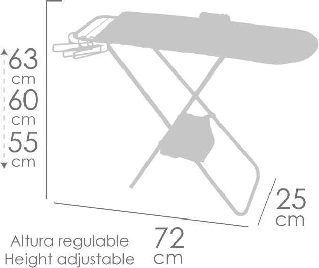 Del paketa so praktični dodatki za popolno igro – plastični likalnik, 3 obešalniki za oblekice in tekstilna košarica, pritrjena na konstrukcijo. Deska je zložljiva, enostavna za prenašanje in shranjevanje, kakovostni materiali (kovina, plastika, tekstil) pa zagotavljajo vzdržljivost pri vsakodnevni uporabi.