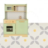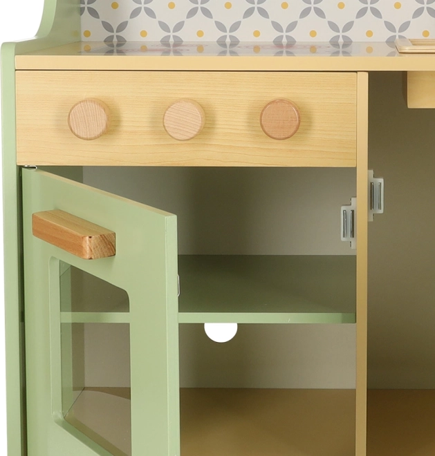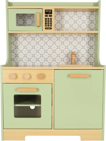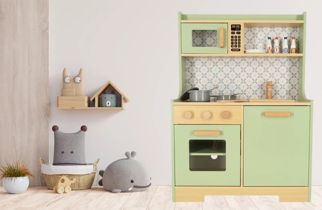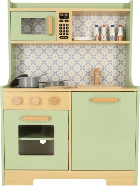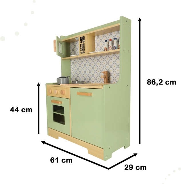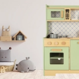 Omogočite otrokom posnemati starše v varnem okolju z mint zeleno leseno kuhinjo. Vsebuje vse potrebne elemente, kot so pečica, mikrovalovna pečica, premičen štedilnik in umivalnik, ki oddajajo realistične zvoke za čim bolj verodostojno simulacijo kuhanja.