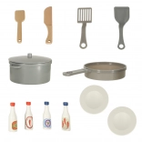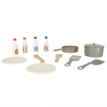 Set vsebuje bogat komplet pripomočkov, ki vključuje plastično ponev, lonec s pokrovom, lesene jedilne pripomočke in krožnike. Za popolno dekoracijo jedi ne manjka niti štiri različne vrste omak.