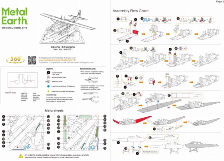 Model hidroplana Cessna 182 Skylane znamke Metal Earth je idealen izziv za vse, ki iščejo podrobno dodelan model. Kompleksnost in natančnost modela sta zagotovljeni z laserskim graviranjem, kar vodi do osupljivega rezultata. Komplet vsebuje: