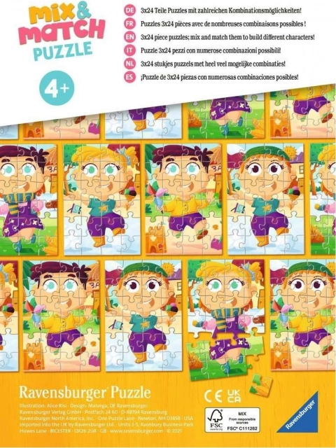 Odkrijte zabavno sestavljanje z edicijo Mix & Match, kjer domišljija ne pozna meja. V eni škatli najdete tri kakovostne puzzle s 24 kosi, ki jih lahko sestavite klasično po slikah ali pa poljubno mešate in ustvarjate nove, duhovite like v barvitih oblekah.